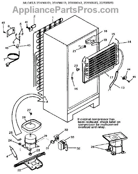 This is a compressor used in several types of home appliances. The compressor is designed to take cold gas in the appliance and place it under pressure so the gas raises in temperature. It is then moved through the refrigerator system to ensure the unit stays cold throughout the appliance. This part can become damaged or malfunction, which may cause the motor to stop running, make the motor noisier, or cause the motor to never stop running.If this happens, the compressor will need to be replaced. A basic set of tools will be needed. A pair of work gloves can also be useful. First, locate the compressor as it may be in various locations depending on the appliance model. Unplug the appliance before removing the compressor. Install the new compressor using the original bolts and nuts before turning the power back on and resuming normal use.This part is sold on an individual basis. The compressor is made to be used with refrigerators, ranges, stoves, ovens, air conditioners, and freezers created by Gibson, Frigidaire, Kelvinator, Montgomery Wards, Westinghouse, Tappan, JCPenney, Universal, and Kenmore. It is an authentic OEM replacement part directly sourced from the manufacturer.