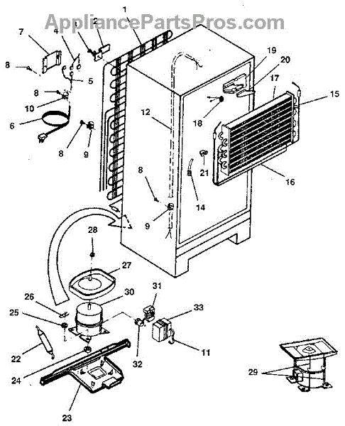 This is a compressor used in several types of home appliances. The compressor is designed to take cold gas in the appliance and place it under pressure so the gas raises in temperature. It is then moved through the refrigerator system to ensure the unit stays cold throughout the appliance. This part can become damaged or malfunction, which may cause the motor to stop running, make the motor noisier, or cause the motor to never stop running.If this happens, the compressor will need to be replaced. A basic set of tools will be needed. A pair of work gloves can also be useful. First, locate the compressor as it may be in various locations depending on the appliance model. Unplug the appliance before removing the compressor. Install the new compressor using the original bolts and nuts before turning the power back on and resuming normal use.This part is sold on an individual basis. The compressor is made to be used with refrigerators, ranges, stoves, ovens, air conditioners, and freezers created by Gibson, Frigidaire, Kelvinator, Montgomery Wards, Westinghouse, Tappan, JCPenney, Universal, and Kenmore. It is an authentic OEM replacement part directly sourced from the manufacturer.
