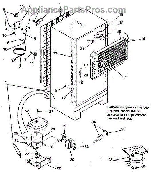 This is a compressor used in several types of home appliances. The compressor is designed to take cold gas in the appliance and place it under pressure so the gas raises in temperature. It is then moved through the refrigerator system to ensure the unit stays cold throughout the appliance. This part can become damaged or malfunction, which may cause the motor to stop running, make the motor noisier, or cause the motor to never stop running.If this happens, the compressor will need to be replaced. A basic set of tools will be needed. A pair of work gloves can also be useful. First, locate the compressor as it may be in various locations depending on the appliance model. Unplug the appliance before removing the compressor. Install the new compressor using the original bolts and nuts before turning the power back on and resuming normal use.This part is sold on an individual basis. The compressor is made to be used with refrigerators, ranges, stoves, ovens, air conditioners, and freezers created by Gibson, Frigidaire, Kelvinator, Montgomery Wards, Westinghouse, Tappan, JCPenney, Universal, and Kenmore. It is an authentic OEM replacement part directly sourced from the manufacturer.