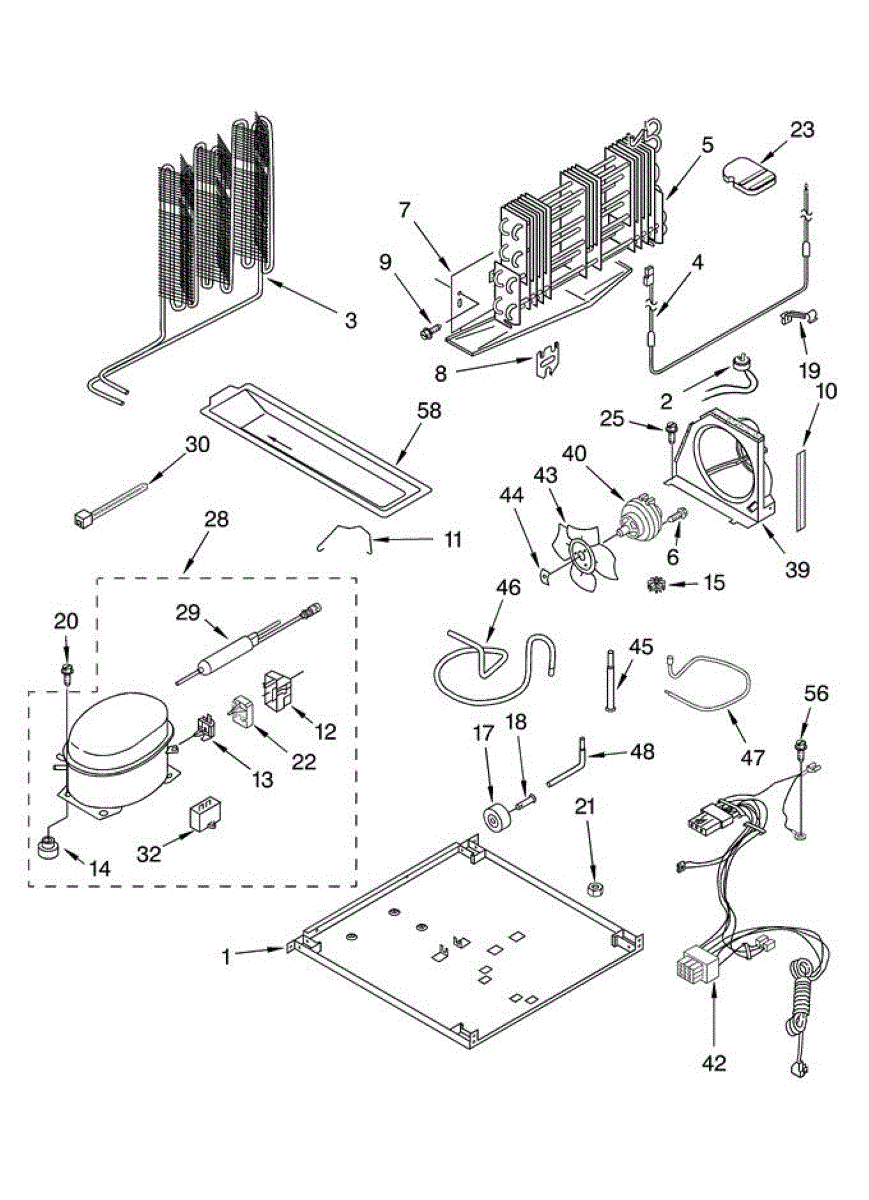 Secures the compressor to the refrigerator frame. Replace if strap is cracked, broken, or missing to properly mount and stabilize the compressor unit.