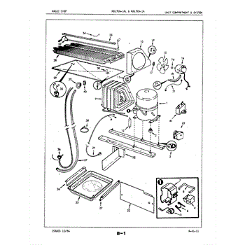 Plastic defrost pan. Evaporator pan hangs from side rails and rests on compressor.