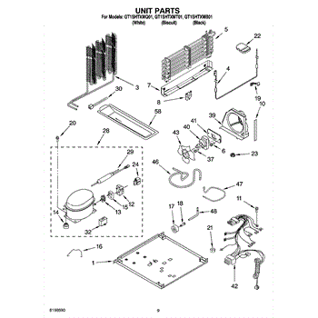 Secures the compressor to the refrigerator frame. Replace if strap is cracked, broken, or missing to properly mount and stabilize the compressor unit.