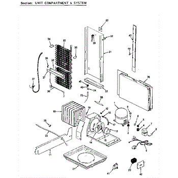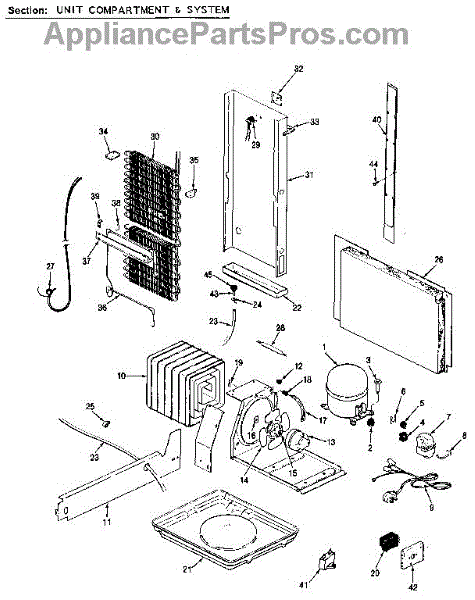Plastic defrost pan. Evaporator pan hangs from side rails and rests on compressor.