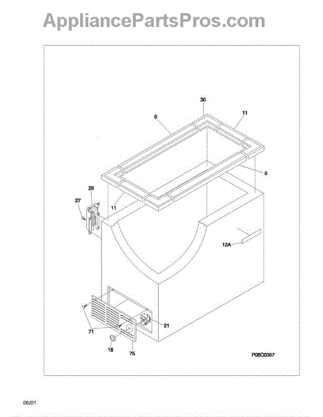 White plastic corner trim breaker for chest and upright freezers. Replaces cracked, broken, or missing corner trim pieces. Decorative trim component.