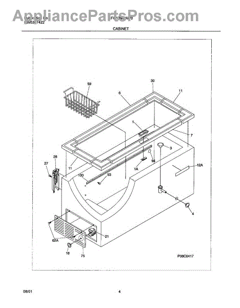 White access panel for chest and freestanding freezers. Covers internal components and provides service access. Replace if cracked, discolored, or missing.