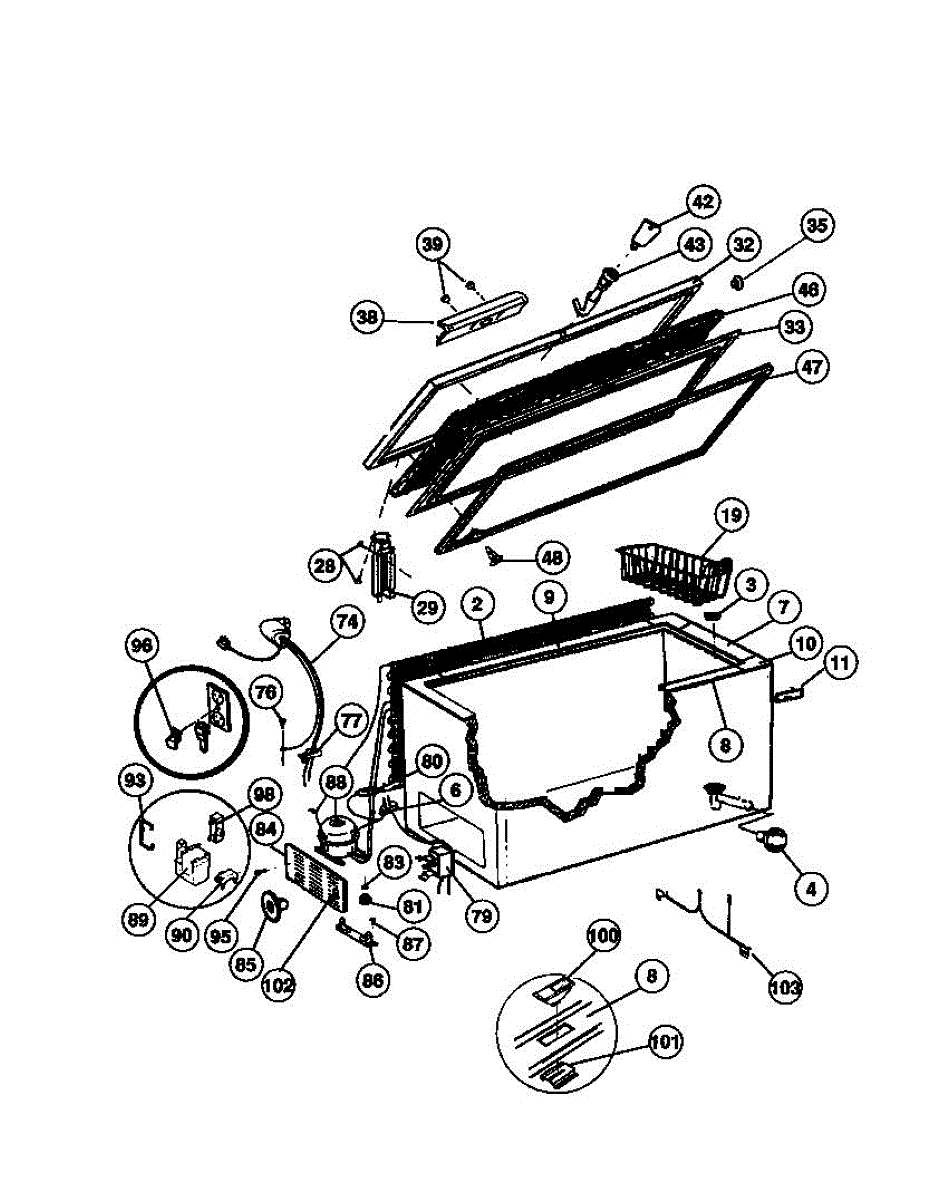 White access panel for chest and freestanding freezers. Covers internal components and provides service access. Replace if cracked, discolored, or missing.