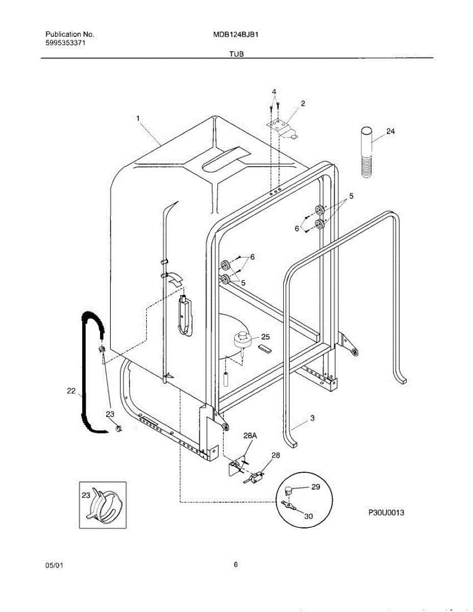 Dishwasher drain hose connects the pump to your sink or disposal. Replace if cracked, leaking, or damaged to prevent water backflow and leaks.
