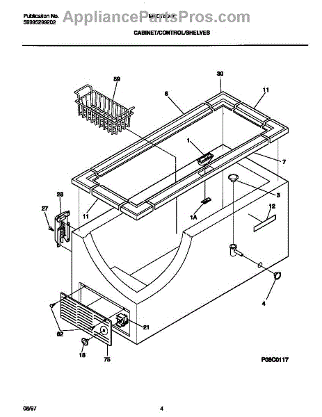 White access panel for chest and freestanding freezers. Covers internal components and provides service access. Replace if cracked, discolored, or missing.