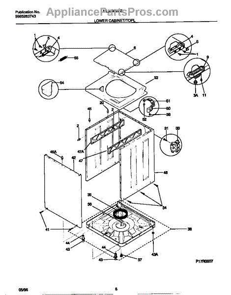 Rubber grommet cushions washer lid to reduce noise and prevent scratching. Replace when worn, cracked, or missing to restore proper lid alignment.