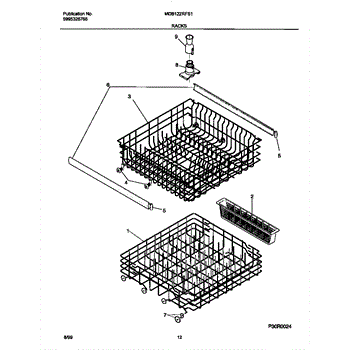 Replace your dishwasher's lower dishrack assembly if it's rusted, cracked, or has broken tines. This gray rack holds dishes securely during wash cycles.