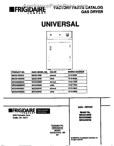 Parts for Frigidaire MDG216RBW2: 01 - Cover Parts