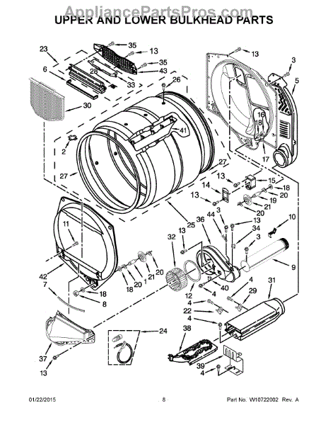 This front drum bulkhead is the stationary front panel that supports the dryer drum and seals the drum opening to maintain proper airflow and drum alignment for reliable drying performance. What it does: