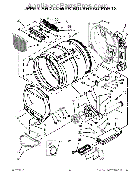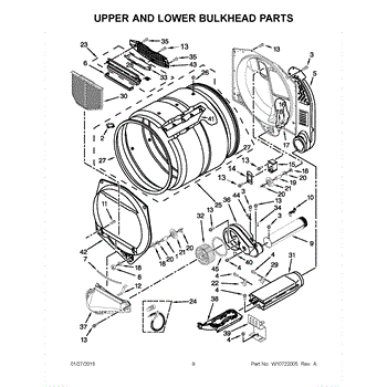 This front drum bulkhead is the stationary front panel that supports the dryer drum and seals the drum opening to maintain proper airflow and drum alignment for reliable drying performance. What it does: