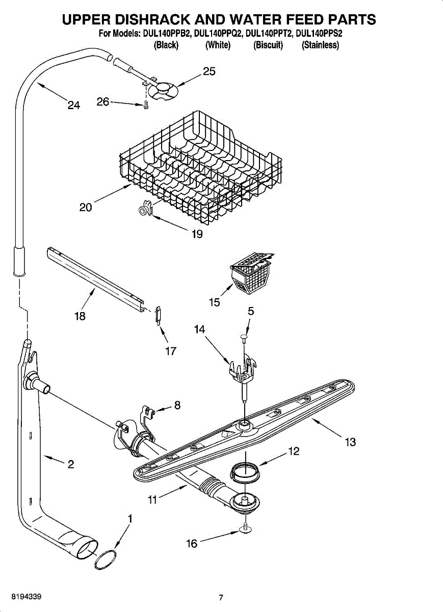 Water supply tube for dishwashers. Connects water inlet to spray system. Replace if tube is cracked, leaking, kinked, or damaged during service.