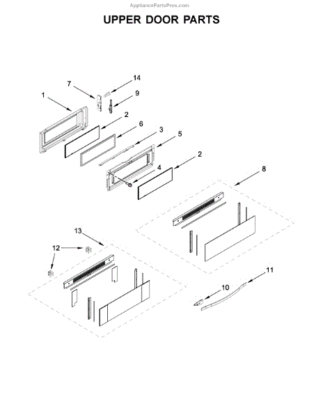 Upper door frame glass for oven door window. Replaces cracked, fogged, or broken upper glass section. Restores clear viewing of cooking progress.
