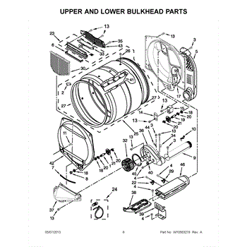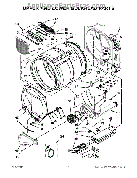 This front drum bulkhead is the stationary front panel that supports the dryer drum and seals the drum opening to maintain proper airflow and drum alignment for reliable drying performance. What it does: