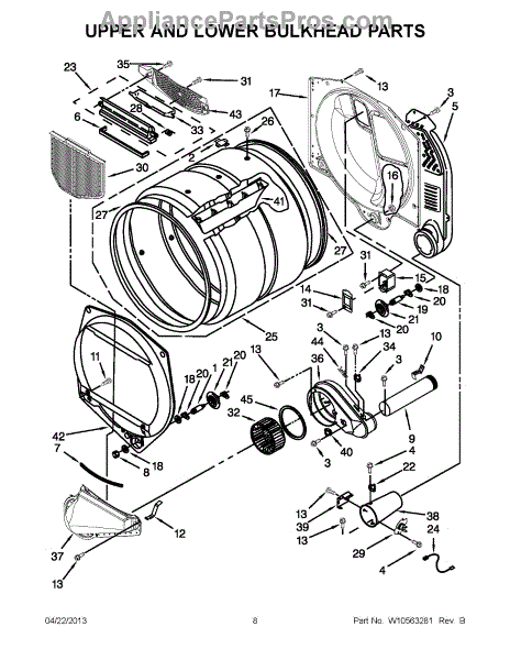 This front drum bulkhead is the stationary front panel that supports the dryer drum and seals the drum opening to maintain proper airflow and drum alignment for reliable drying performance. What it does: