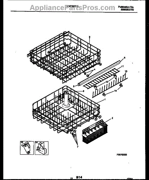 The Silverware Basket is an OEM replacement part for Frigidaire dishwashers. It holds and protects silverware during the dishwashing cycle. The basket is designed to fit seamlessly within the dishwasher, providing a convenient and accessible storage solution for silverware.