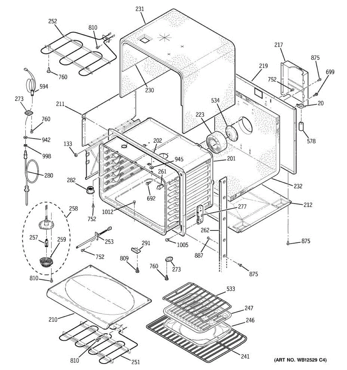 Oven cavity wrapper assembly forms the outer shell around the cooking chamber. Replace if cracked, damaged, or rusted to restore structural integrity.