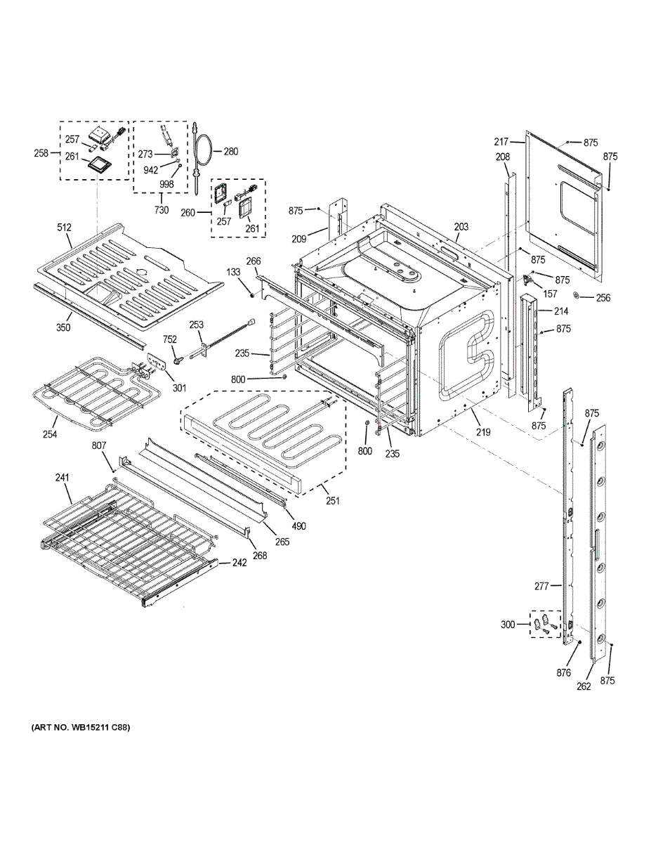 Oven rack slide assembly enables smooth gliding for easy loading and unloading. Replace if bent, worn, or seized to restore proper movement and support.