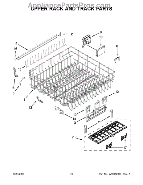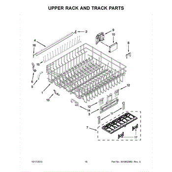 The Upper Dish Rack is an OEM replacement part for Whirlpool dishwashers. Located on the upper level inside the tub, it provides an area for washing smaller dishes, utensils, and glasses.