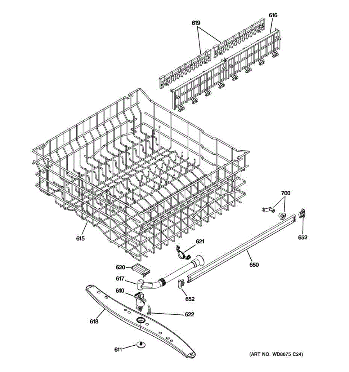 This middle spray arm assembly mounts at the center wash level and distributes pressurized water across both racks. Replacing a damaged or clogged arm restores even spray coverage and helps resolve weak cleaning performance, especially on the upper rack.