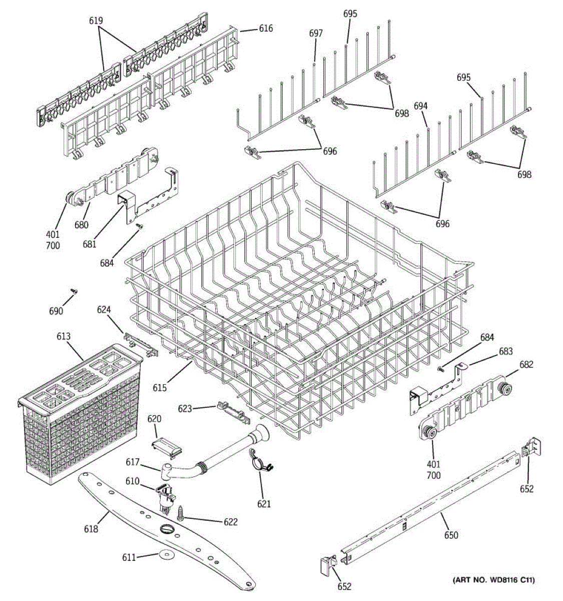 Upper dishrack roller kit with 4 nylon rollers and 4 axles. Replace broken, cracked, or worn rollers that prevent smooth rack gliding in your dishwasher.