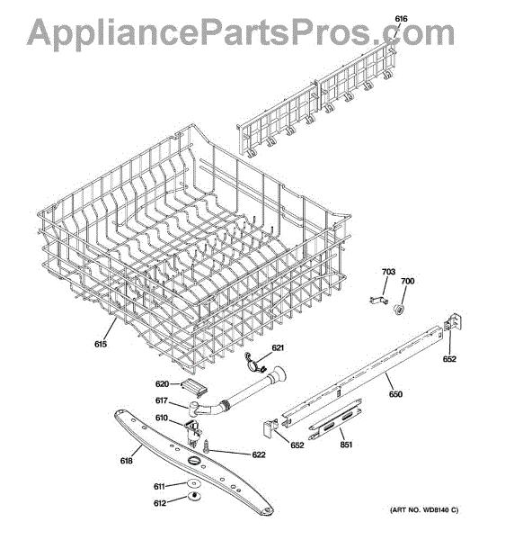 Upper dishrack assembly for dishwashers. Holds dishes and cookware on top rack. Replace if rusted, cracked, or plastic coating is peeling. Includes rollers.