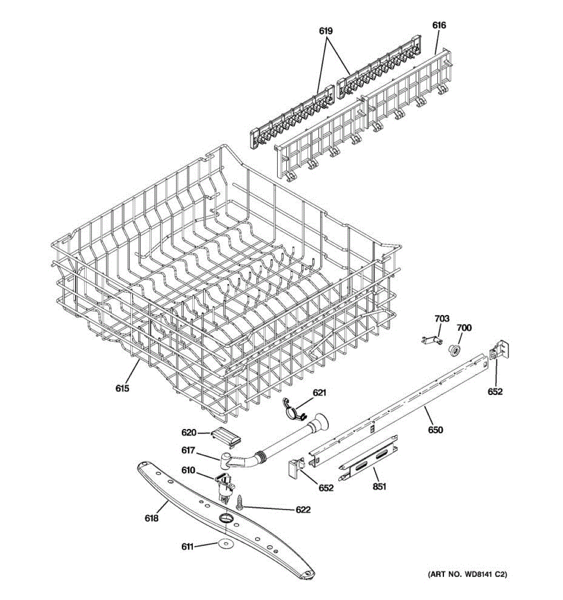 Upper dishrack assembly for dishwashers. Holds dishes and cookware on top rack. Replace if rusted, cracked, or plastic coating is peeling. Includes rollers.