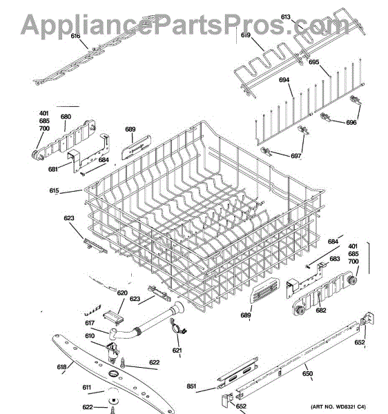 Upper dishrack assembly for dishwashers. Holds dishes and cookware on top rack. Replace if rusted, cracked, or plastic coating is peeling. Includes rollers.