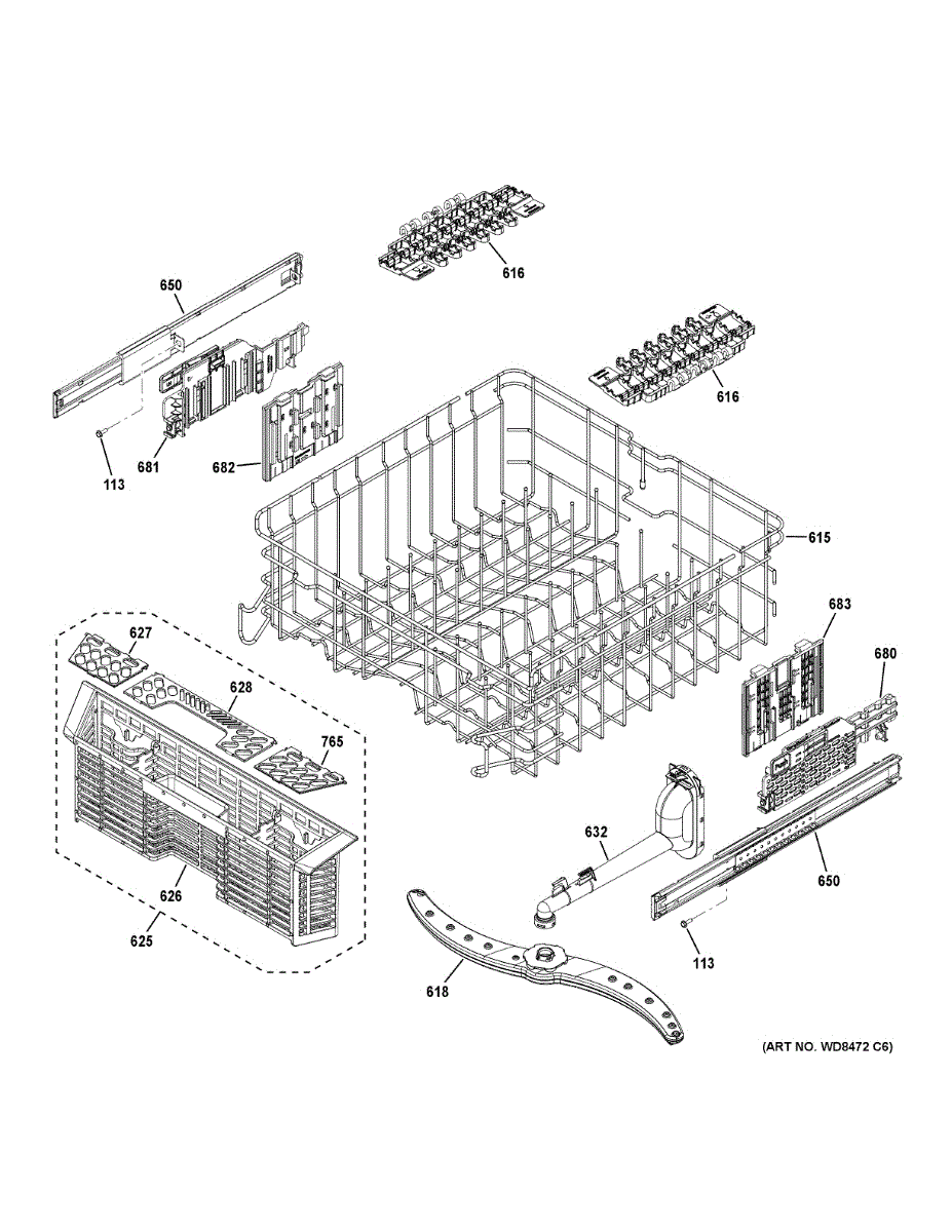 Replacement upper rack for dishwasher. Holds cups, glasses, and small dishes in the top position. Needed when original is cracked, broken, or warped.