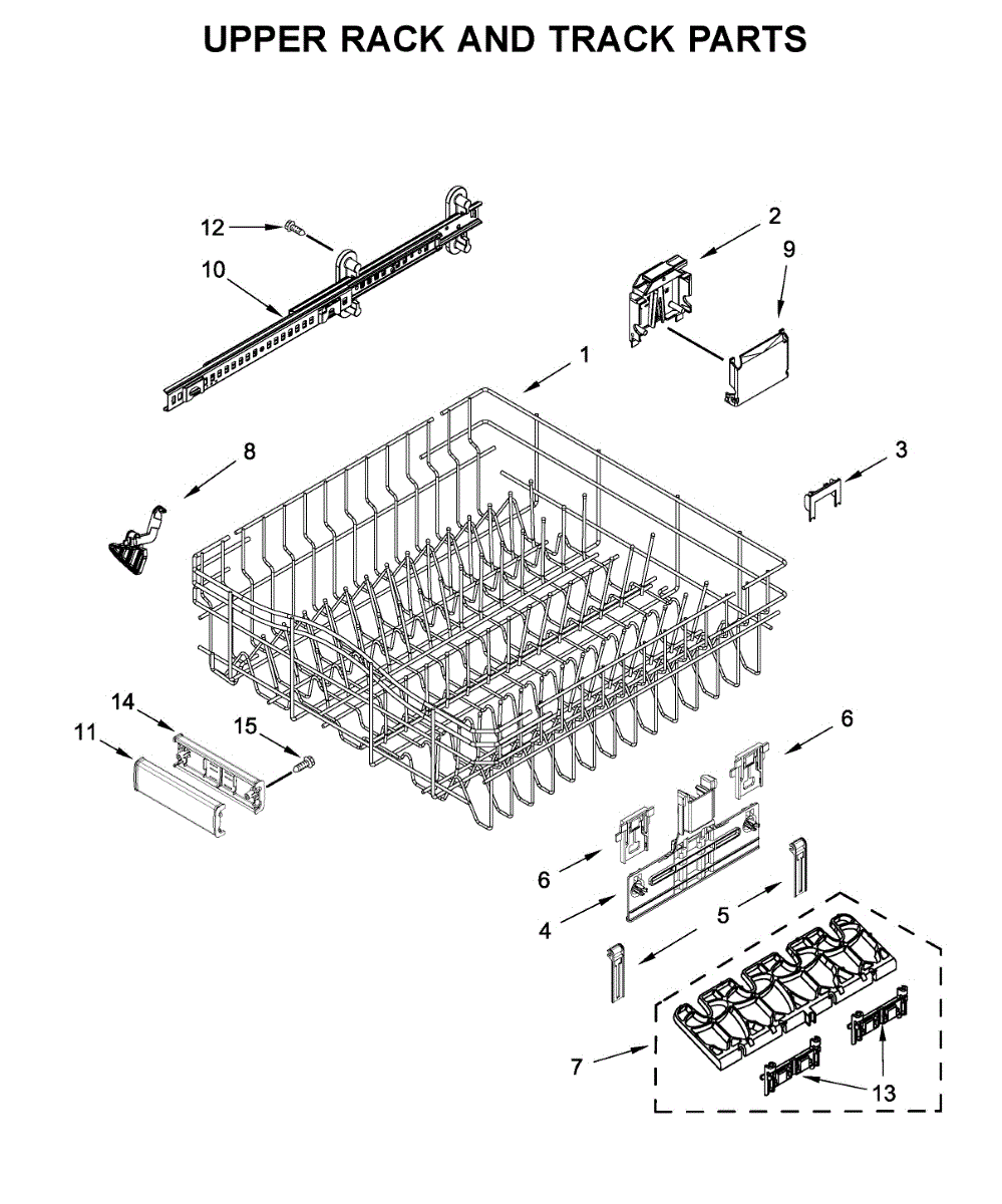 Replacement upper dishrack for dishwashers. Holds dishes, glasses, and utensils during wash cycles. Replace if rusted, cracked, or broken tines damage items.