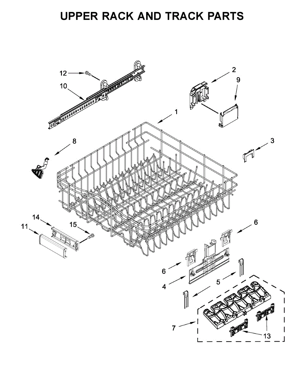 Replacement upper dishrack for dishwashers. Holds dishes, glasses, and utensils during wash cycles. Replace if rusted, cracked, or broken tines damage items.