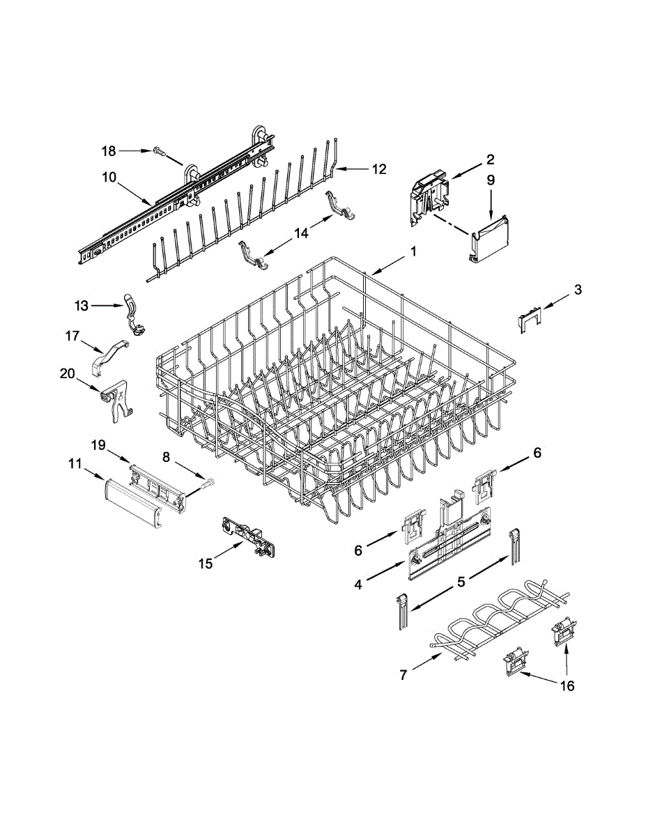 Right-hand track assembly that guides the upper dishwasher rack as it slides in and out. Replace if cracked, broken, or ball bearings fall out.
