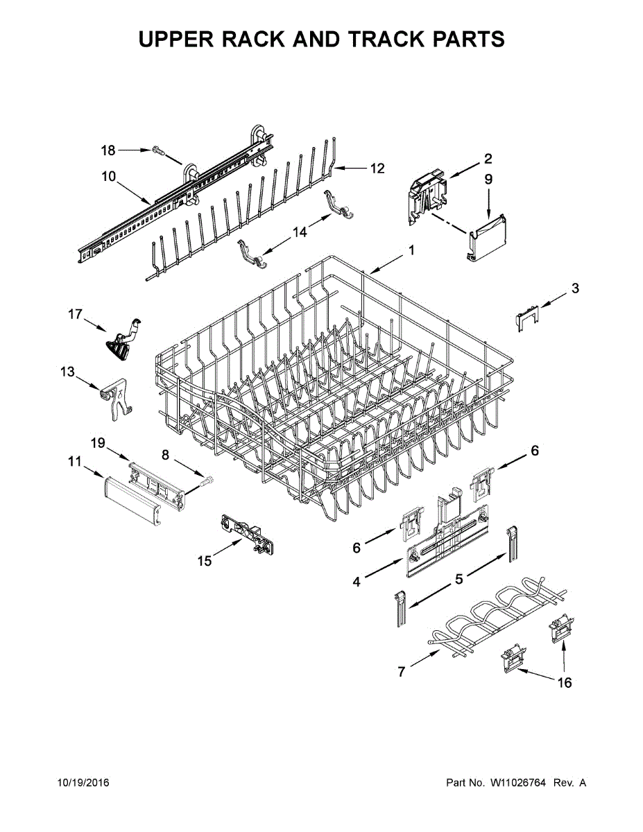 Right-hand track assembly that guides the upper dishwasher rack as it slides in and out. Replace if cracked, broken, or ball bearings fall out.