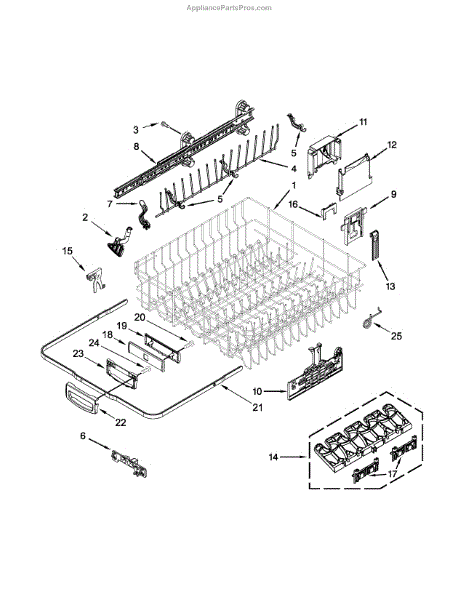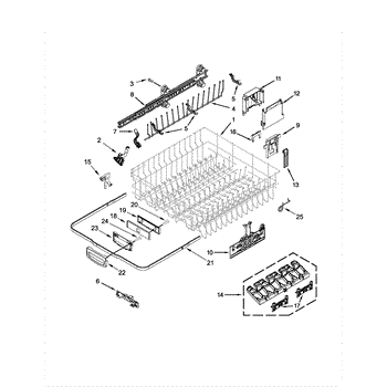The Upper Dish Rack is an OEM replacement part for Whirlpool dishwashers. Located on the upper level inside the tub, it provides an area for washing smaller dishes, utensils, and glasses.