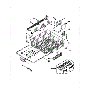 The Upper Dish Rack is an OEM replacement part for Whirlpool dishwashers. Located on the upper level inside the tub, it provides an area for washing smaller dishes, utensils, and glasses.