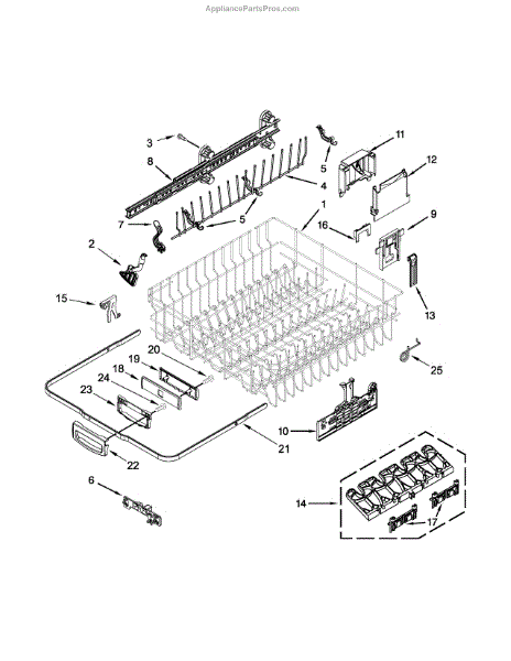 The Upper Dish Rack is an OEM replacement part for Whirlpool dishwashers. Located on the upper level inside the tub, it provides an area for washing smaller dishes, utensils, and glasses.