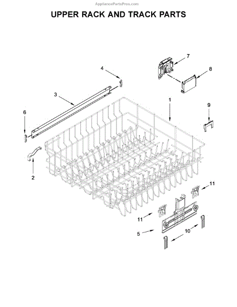 Replacement upper dishrack for dishwashers. Holds dishes, glasses, and utensils during wash cycles. Replace if rusted, cracked, or broken tines damage items.