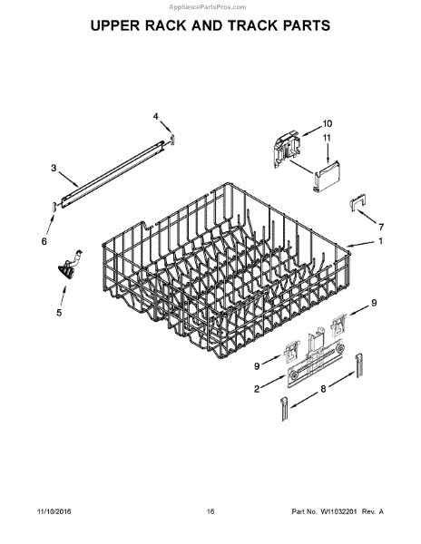Replacement upper dishrack for dishwashers. Holds dishes, glasses, and utensils during wash cycles. Replace if rusted, cracked, or broken tines damage items.