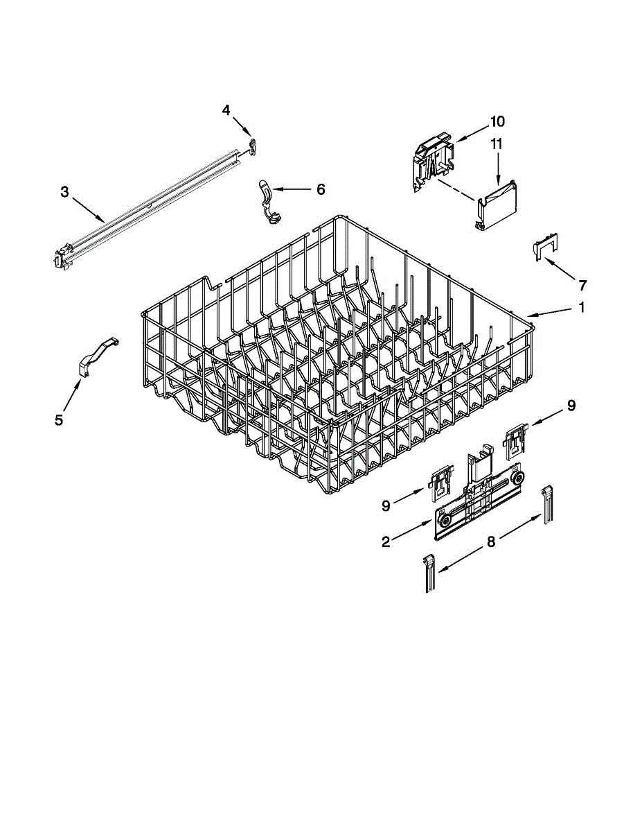 Replacement upper dishrack for dishwashers. Holds dishes, glasses, and utensils during wash cycles. Replace if rusted, cracked, or broken tines damage items.