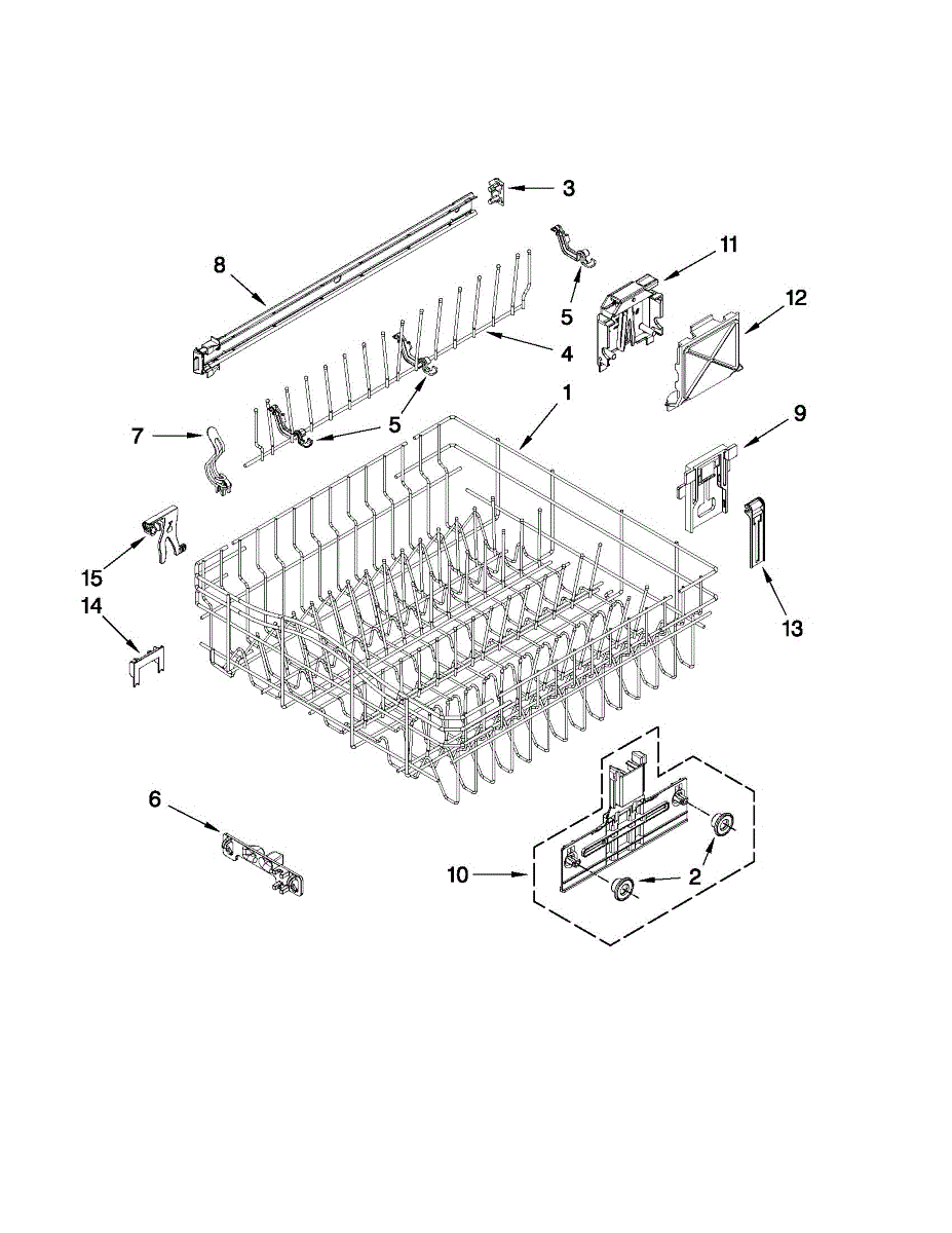 Upper dish rack assembly for dishwashers. Holds glasses, cups, and small items on the top level. Replace if cracked, warped, rusted, or deteriorating.