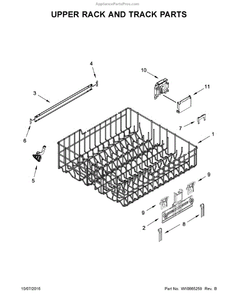 Replacement upper dishrack for dishwashers. Holds dishes, glasses, and utensils during wash cycles. Replace if rusted, cracked, or broken tines damage items.