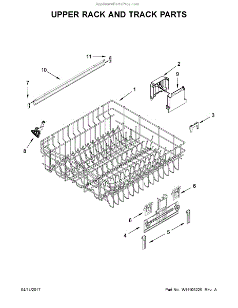 Replacement upper dishrack for dishwashers. Holds dishes, glasses, and utensils during wash cycles. Replace if rusted, cracked, or broken tines damage items.