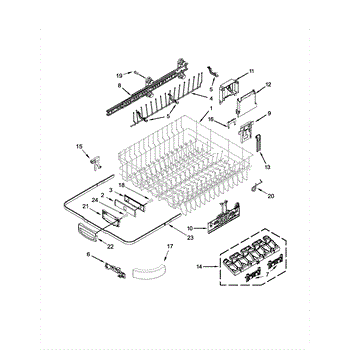 The Upper Dish Rack is an OEM replacement part for Whirlpool dishwashers. Located on the upper level inside the tub, it provides an area for washing smaller dishes, utensils, and glasses.