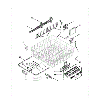 The Upper Dish Rack is an OEM replacement part for Whirlpool dishwashers. Located on the upper level inside the tub, it provides an area for washing smaller dishes, utensils, and glasses.
