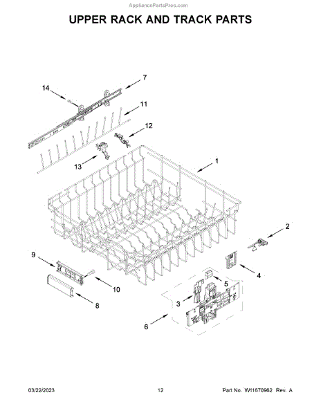 Replacement lower dish rack bar that restores support and alignment to the dishwasher's lower rack. It helps keep dishes steady and the rack running smoothly so dishes get proper wash coverage and don't tip. What it does