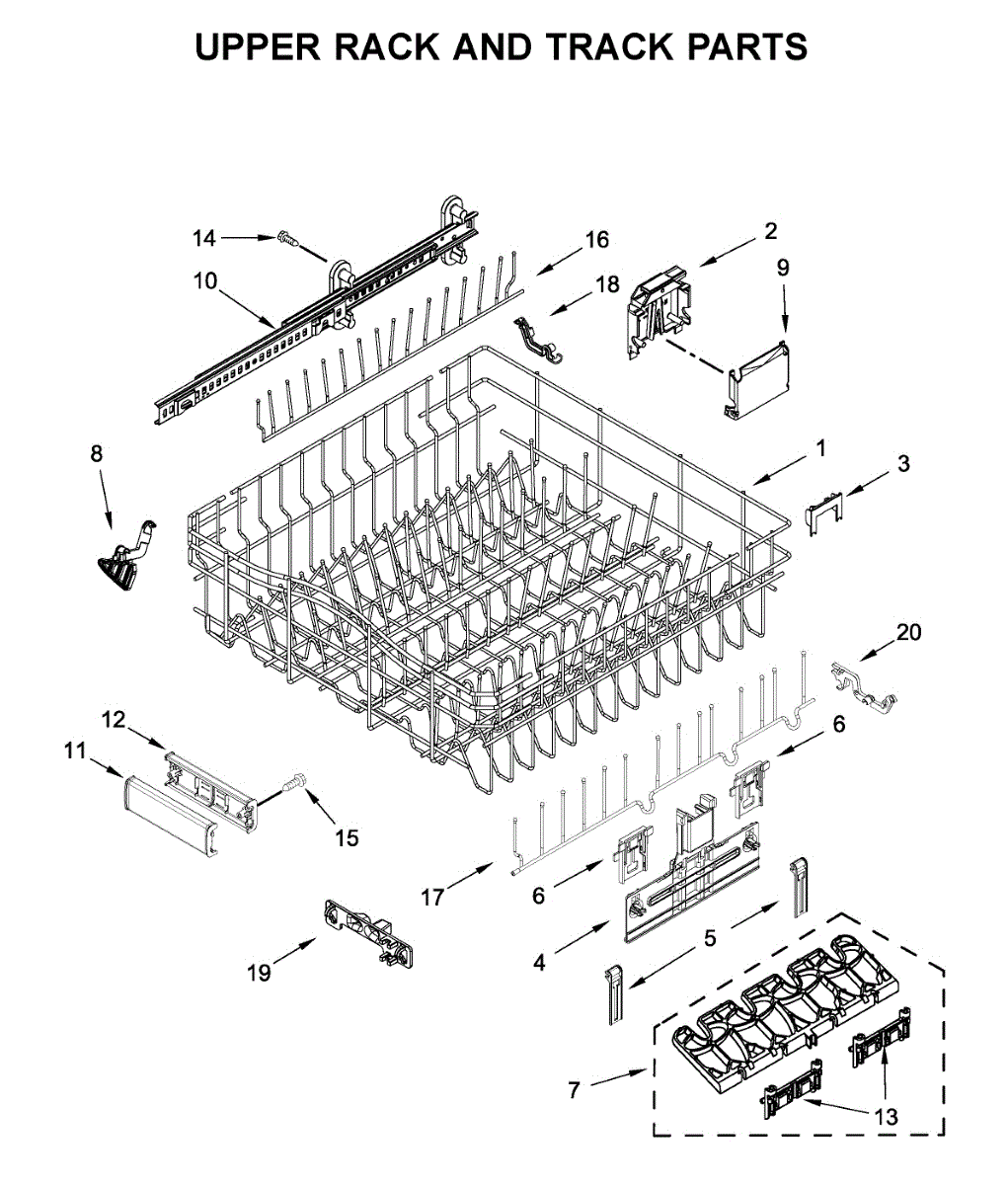 Upper dish rack assembly for dishwashers. Holds glasses, cups, and small items on the top level. Replace if cracked, warped, rusted, or deteriorating.