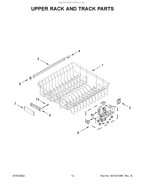 This upper rack adjuster mounts on the right side of the dishwasher's rack system. It lets you raise or lower the rack and keeps it level so you can load taller items and maintain consistent spray coverage.