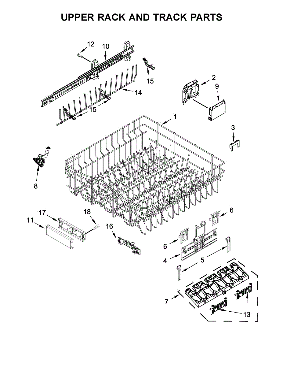 Right-hand track assembly that guides the upper dishwasher rack as it slides in and out. Replace if cracked, broken, or ball bearings fall out.